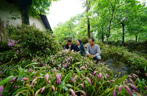穿過竹林,孫茂梅來(lái)到農(nóng)戶袁二妹家的石斛花田。蒼翠的樹叢間,粉紫色的石斛花滿山滿谷,一簇簇、一團(tuán)團(tuán),散發(fā)著淺淺的清香。