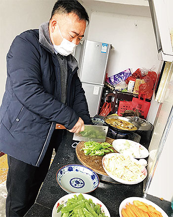 湖北省通山縣黃沙郵政支局阮文學為高速路口疫情防控值守人員做飯。