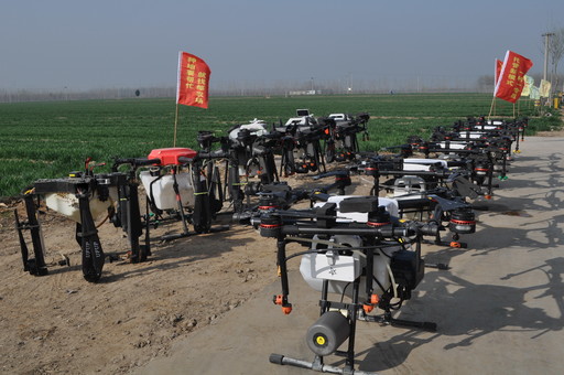 飛防作業(yè)前,11架無人機(jī)整齊排開,場(chǎng)面甚是壯觀。