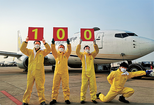 3月21日,郵航CF9016航班于7點(diǎn)19分飛抵武漢天河機(jī)場(chǎng),飛行員在機(jī)場(chǎng)擺起pose,慶祝中國(guó)郵政航空?qǐng)?zhí)飛疫區(qū)航班100架次這一榮耀時(shí)刻。