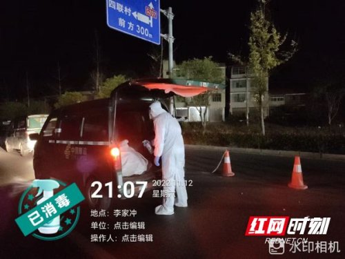 21點10分,郵車到達(dá)邵陽縣交接防疫卡口,邵陽縣郵政分公司陳偉、劉澤湘兩位同志穿上密封的防護服早已等候多時,他們將郵袋做了全面消殺處理,交接完成后駕駛郵車向目的地駛?cè)ァ?1點50分,郵件到達(dá)邵陽縣李家沖,兩人與其家人完成面交。