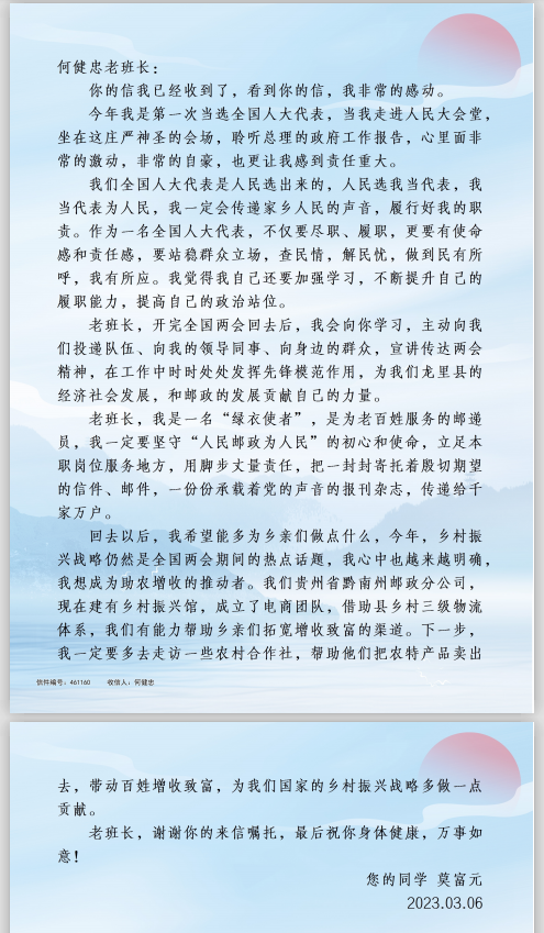 當晚,何健忠懷著一名老代表的責任感,拿出紙筆在案頭奮筆疾書,用傳統(tǒng)的書信形式、也代表著郵政人的儀式感,給兩位郵政系統(tǒng)新當選的全國人大代表郭紅崗、莫富元送上了殷殷寄語。