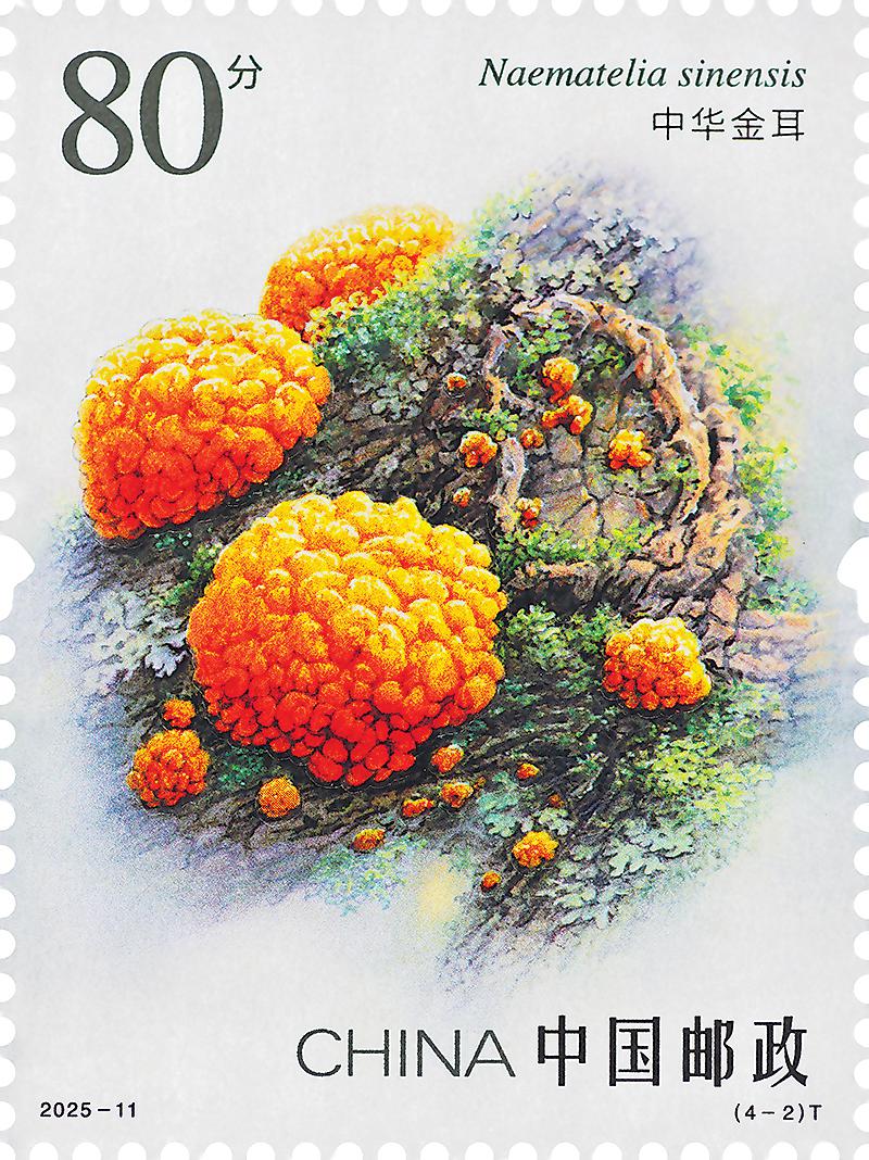 第一枚“變綠紅菇”,設(shè)計(jì)突出其青翠欲滴的色澤,并融入森林生態(tài)背景,使整體形象兼具自然野趣與美學(xué)韻味。第二枚“中華金耳”(如上圖),采用獨(dú)特的博物畫風(fēng)格精準(zhǔn)還原金耳獨(dú)特的皺紋與柔韌的果凍狀質(zhì)地。第三枚“松口蘑”,采用細(xì)致的筆法刻畫松口蘑菌蓋表面的細(xì)微紋理及菌柄的粗壯形態(tài),同時(shí)加入松林元素背景,以柔和的光影表現(xiàn)其生長環(huán)境,增強(qiáng)畫面的自然氛圍。第四枚“干巴菌”,以精細(xì)入微的線條勾勒干巴菌叢生分枝的復(fù)雜結(jié)構(gòu),輔以簡(jiǎn)潔柔和的背景突出主體,再現(xiàn)了其鮮活之態(tài)。