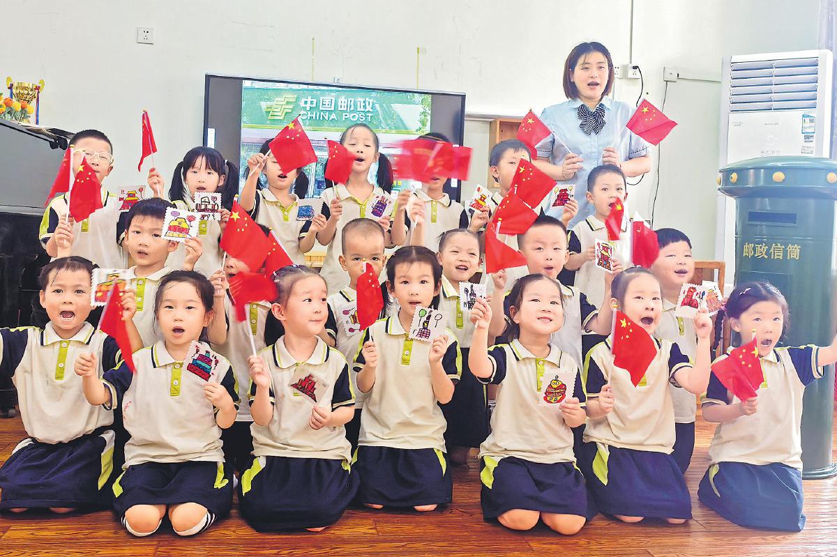 “十一”國(guó)慶節(jié)即將到來之際,為將愛國(guó)主義的種子深植心田,讓民族自豪感蓬勃生長(zhǎng),江蘇省南通市海門區(qū)郵政分公司聯(lián)合該區(qū)通源幼兒園開展“郵趣慶華誕”主題活動(dòng),通過辨識(shí)郵政業(yè)務(wù)、學(xué)做郵帽、手繪郵票和明信片等形式,讓孩子們體驗(yàn)豐富多彩的郵政文化,共同迎接中華人民共和國(guó)成立76周年。圖為該幼兒園小朋友手舉國(guó)旗和手繪的郵票圖案,齊聲祝福偉大祖國(guó)生日快樂。