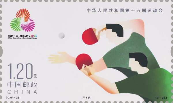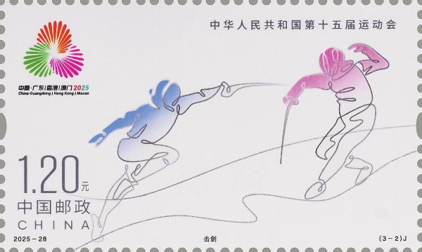 第十五屆全運會是粵港澳三地承辦的我國規(guī)模最大、水平最高、影響最廣的綜合性運動會,也是香港、澳門首次承辦全國運動會。該套郵票由內(nèi)地、港、澳三地設(shè)計師韓家英、陳幼堅、歐俊軒設(shè)計。第1枚郵票表現(xiàn)內(nèi)容為花樣游泳,郵票圖案以躍動的剪影表現(xiàn)運動員的優(yōu)雅身姿,力與美相生共舞,以獨特的視角展現(xiàn)出運動員在水中的靈動瞬間。第2枚郵票表現(xiàn)內(nèi)容為擊劍,郵票圖案以飛動的線條表現(xiàn)運動員迅猛矯健的身姿,剛與柔交織碰撞,以極簡的構(gòu)圖展現(xiàn)出運動員激烈的對抗場景。第3枚郵票表現(xiàn)內(nèi)容為乒乓球,郵票圖案以鮮明簡練的色塊表現(xiàn)運動員蓄勢待發(fā)的專注之姿,強(qiáng)與韌相融并濟(jì),以幾何化、概括化的現(xiàn)代極簡插畫造型,展現(xiàn)出運動員發(fā)球瞬間的氣勢和張力,營造出緊張的比賽氛圍。