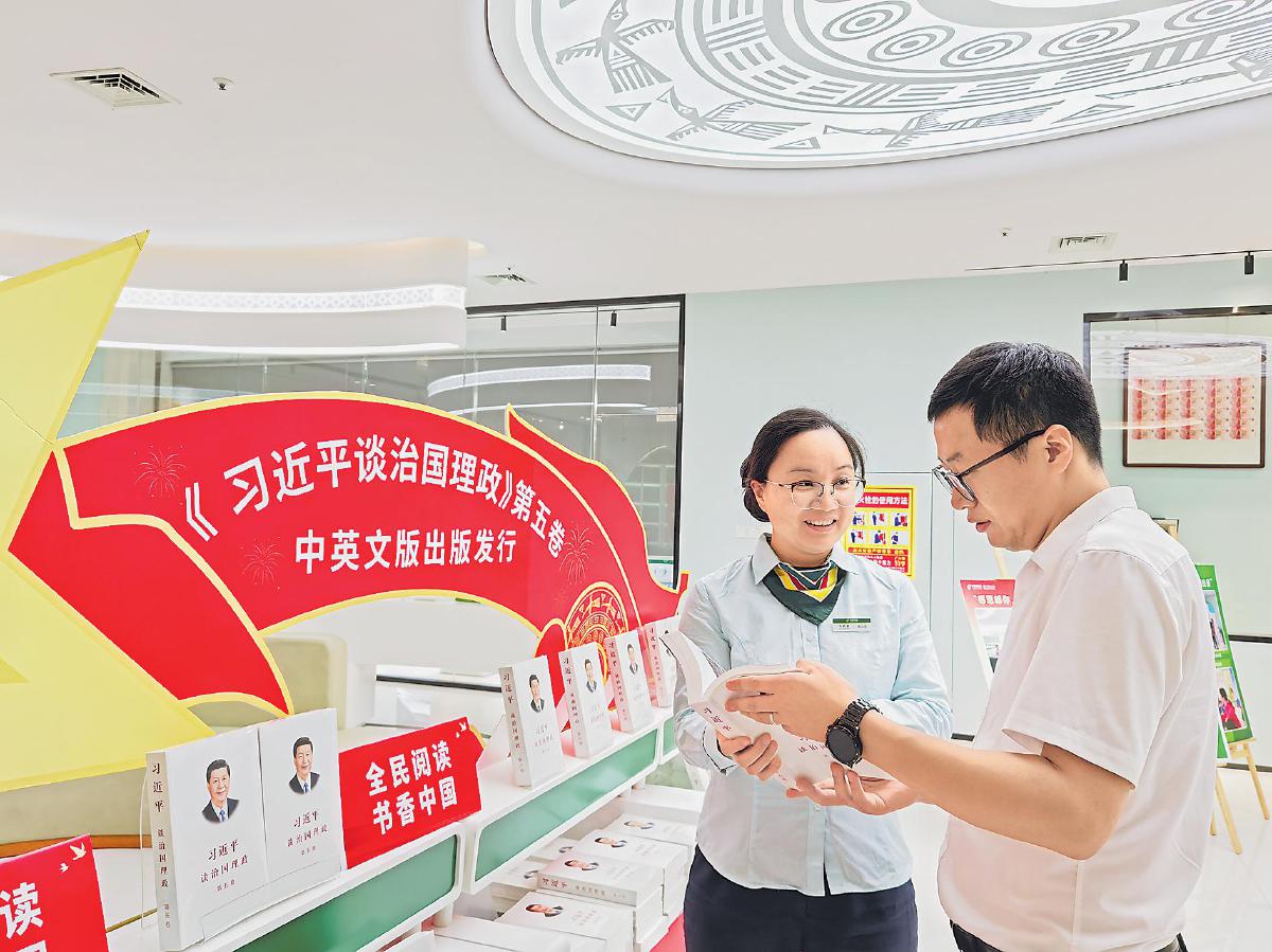 近日,走進(jìn)廣西壯族自治區(qū)南寧市金浦路郵政支局,一抹鮮艷的紅色映入眼簾,紅色背景的展板下,整齊排列著《習(xí)近平談治國理政》第五卷圖書。不少讀者在此駐足,有的神情專注地翻看,有的在聆聽工作人員介紹。市民張先生在選購圖書的人群里格外顯眼,他不僅自己購買,還打算幫家人和朋友代買。他表示,自己是一名黨員,《習(xí)近平談治國理政》第五卷圖書對(duì)提升黨性修養(yǎng)和理論素養(yǎng)大有裨益?!霸卩]政網(wǎng)點(diǎn)能夠買到正版重點(diǎn)圖書,十分方便,工作人員很貼心地向我介紹圖書的信息。”張先生說。